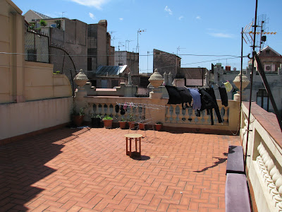 My apartment building is situated on the corner of Gran de Gracia, the busiest street in Gracia, hence the noise outside my bedroom window, and Carrer de Sant Domenec, a narrow alley that only occasionally sees any car traffic. Here's a picture of the view from my roof terrace across and down onto Gran de Gracia.